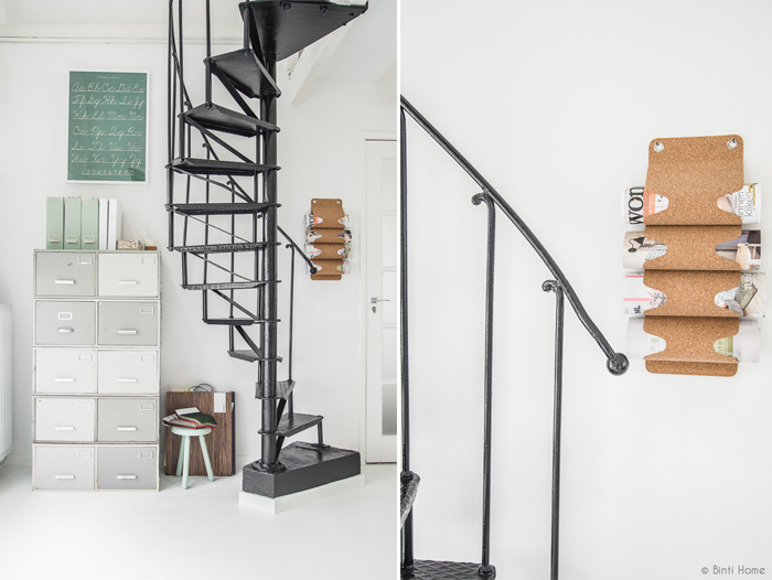 De stalen trap is echt een eyecatcher in de ruimte. De trap stond er al toen ik hier ( twee maanden geleden ) kwam wonen en ik was op slag verliefd. Het is een smalle trap maar met zoveel charme! De metalen ladenkast kocht ik via een oproep op twitter voor een tientje! Voorheen wilde ik de kast graag wit spuiten maar vind hem zo in de ruimte juist prachtig tot zijn recht komen met al die verschillende tinten grijs. De kast ligt vol met kleurenstalen en materiaalstalen die ik voor mijn interieurprojecten gebruik. Erg handig! Boven de kast hangt een poster die ik bij de Vlieger kocht. Naast de trap hangt een wijnflessenhouder, die ik als tijdschriftenrek gebruik, gekocht bij Kurk Design.